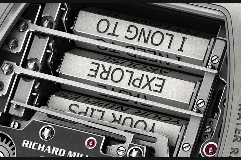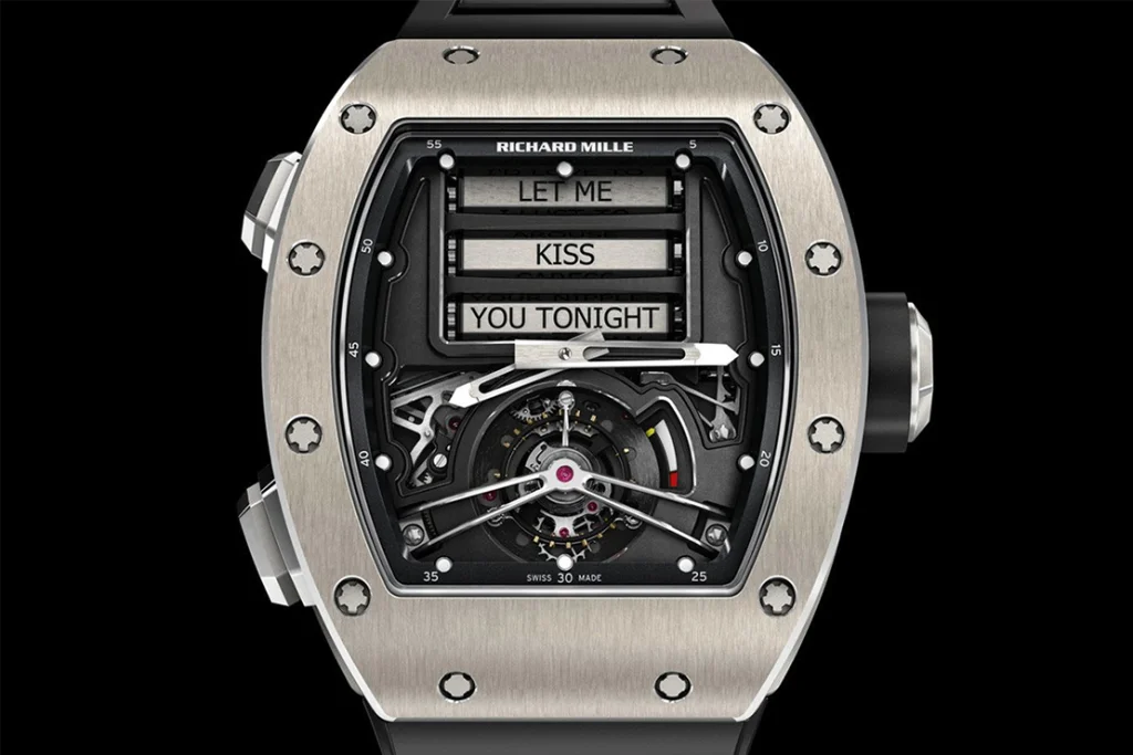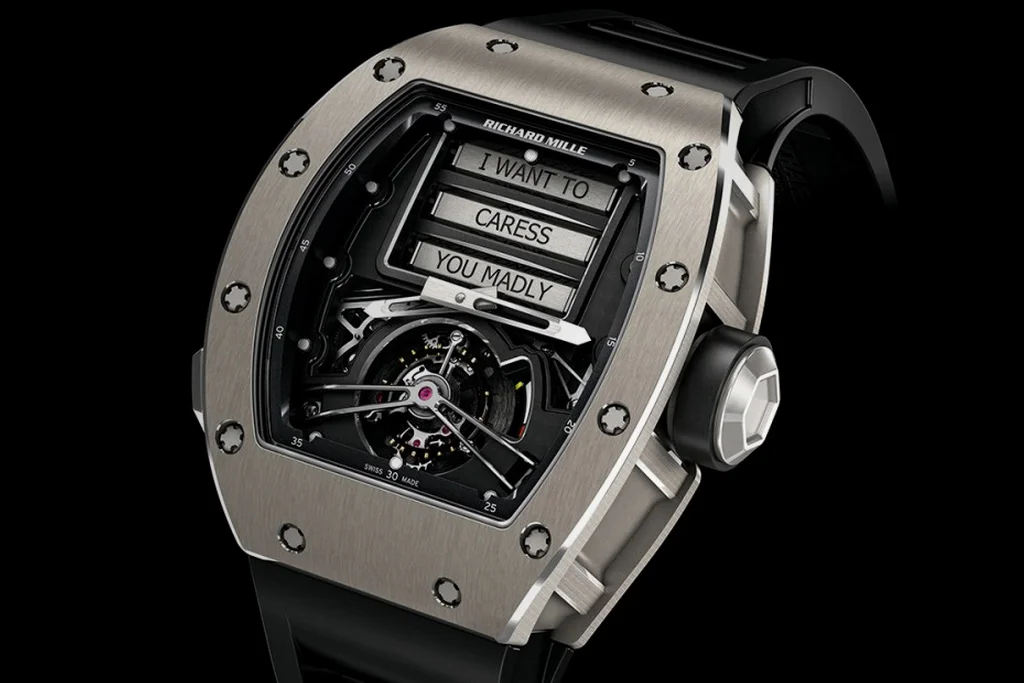 Billed by Mille as “a clear affirmation of the creative longing to reveal our most secret intentions in all their glory,” the RM 69 Erotic Tourbillon is marked by the use of three titanium rollers that are engraved to showcase messages like “Let me kiss you tonight,” “I want to caress you madly” or even “I long to arouse your nipples.” Apart from the eye-popping messages, the Swiss-made design boasts the likes of Duoplan architecture — created in collaboration with Audemars Piguet Renaud & Papi — a 50mm case, rotating bezel, 69-hour power reserve, anti-glare-treated sapphire crystal and more.