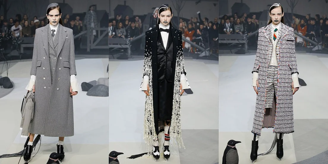 Thom Browne found unlikely, obscure yet genius inspiration in penguins, creating one of NYFW’s most memorable shows. In keeping with his typically high-concept shows, Thom Browne’s AW17 collection took place on ice (specifically an imagined pond in a historical New England town), with models donning ice skates and wearing penguin prints, suits and bags that looked like stuffed animals. Towards the start of the show, the models were dressed mostly in grey, wearing double-breasted coats in herringbone, or patchwork Prince of Wales checks with fur-trimmed hems. As the white and grey argyle sweaters and puffer jackets peetered out, the audience welcomed an array of primary colours, in the form of a striped rainbow coat or a crocheted sweater jacket, playing with the youthfulness of the stuffed penguins and ice-skates. The show, which was akin to a surrealist theatre piece, stood as an argument that fashion is indeed an art form.